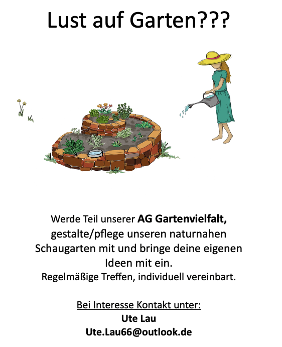 Im Herbst 2024 startete die Arbeitsgruppe "Gartenvielfalt" mit der Anlage einer Benjeshecke und seit dem Frühjahr hat das Projekt Schaugarten seine Flügel ausgebreitet: Das Gelände ist überplant, ein Sandarium ist im Entstehen und der Aushub dient als Wärmeinsel für hoffentlich zukünftig viele Eidechsen. Außerdem sind Beetflächen im Entstehen zu verschiedenen Themen, vgl. Projekt "Gartenvielfalt", Betreuung durch Melanie Bänsch, Ute Lau und Petra Wassmann.